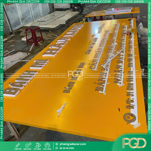- Nền ALU Vàng Khung Sắt: Nền bảng hiệu được làm từ ALU màu vàng năng động, biểu tượng cho niềm vui và sự ấm áp, khung sắt chắc chắn giúp cố định và bảo vệ bảng hiệu trước gió bão.