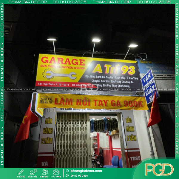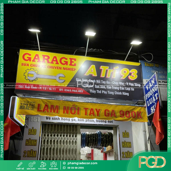 Với kích thước mặt tiền ấn tượng 4m x 1m8, bảng hiệu không chỉ đóng vai trò cung cấp thông tin mà còn là “bộ mặt thương hiệu” thu hút mọi khách hàng tiềm năng. Hãy cùng Phạm Gia Decor đi sâu vào chi tiết kỹ thuật làm bảng hiệu, vật liệu cao cấp và những ưu điểm khiến bảng hiệu này trở thành lựa chọn hàng đầu cho các tiệm sửa xe, garage và cửa hàng kinh doanh hiện đại.