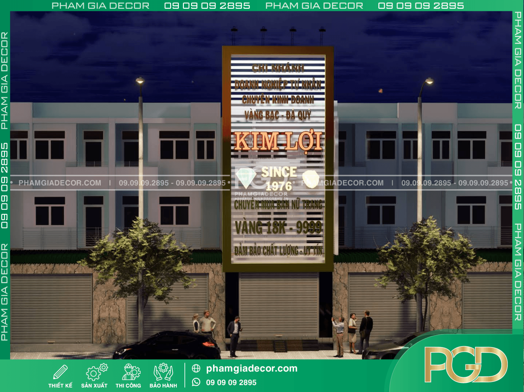 Bảng hiệu lam nhôm định hình tạo cảm giác sang trọng, hiện đại và rất “đô thị”. Hệ lam nhôm chạy dọc theo khung tạo chiều sâu, giúp ánh sáng LED bên trong hắt ra đẹp mắt, làm nổi bật tên thương hiệu và thông điệp chính. Giải pháp này rất phù hợp với tiệm vàng, showroom, ngân hàng, trung tâm thương mại… cần một điểm nhấn mặt tiền khác biệt, dễ nhận diện cả ngày lẫn đêm.