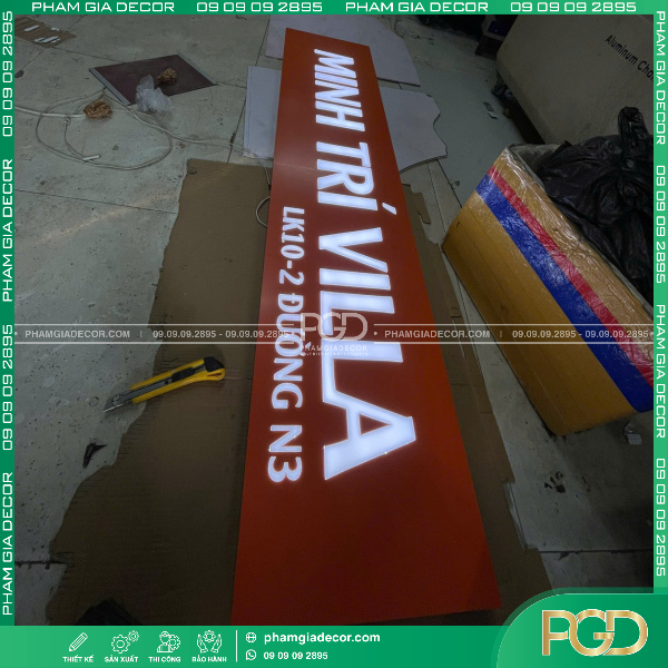 Trong thiết kế ngoại thất và quảng cáo nhận diện, hộp đèn alu luôn là lựa chọn sang trọng và bền vững. Đặc biệt, mẫu hộp đèn Alu Villa Minh Trí với tông cam nổi bật, kỹ thuật khoét lọng – phay nổi hông 5cm – ốp mica âm LED trắng mang đến hiệu ứng ánh sáng hiện đại, dễ nhận diện cả ngày lẫn đêm. Sản phẩm có kích thước 80x30cm, lắp đặt ngoài trời cạnh bảng số nhà, vừa tinh tế vừa bền bỉ với thời tiết.