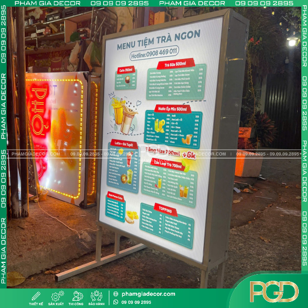 Trong ngành F&B (Thực phẩm và Đồ uống), đặc biệt là kinh doanh Trà và thức uống mang đi (Takeaway), một công cụ quảng cáo vỉa hè phải đáp ứng các tiêu chí: thu hút 2 mặt, thẩm mỹ cao, bền bỉ và dễ dàng di chuyển. Phạm Gia Decor tự hào giới thiệu dự án Hộp Đèn Bạt Không Gân 2 Mặt với kích thước 60cm x 80cm và thiết kế chân lùn độc đáo cho Tiệm Trà Ngon.