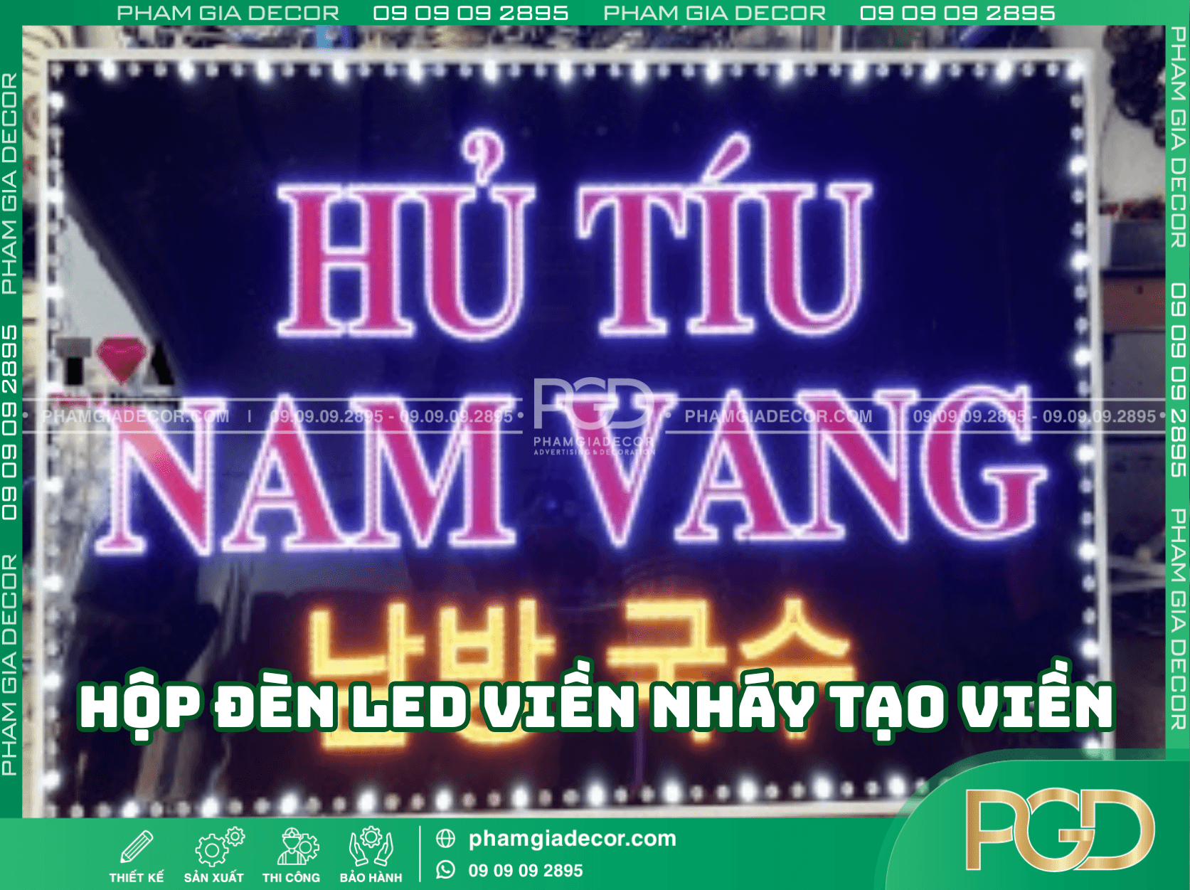 Hộp đèn LED viền nháy tạo viền là một trong những loại hình quảng cáo được ưa chuộng nhất hiện nay nhờ khả năng tạo ra hiệu ứng động bắt mắt, nổi bật hơn hẳn các bảng hiệu tĩnh. Với chi phí hợp lý, loại hộp đèn này giúp cửa hàng, quán ăn của bạn thu hút sự chú ý tối đa, đặc biệt là vào ban đêm.