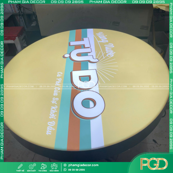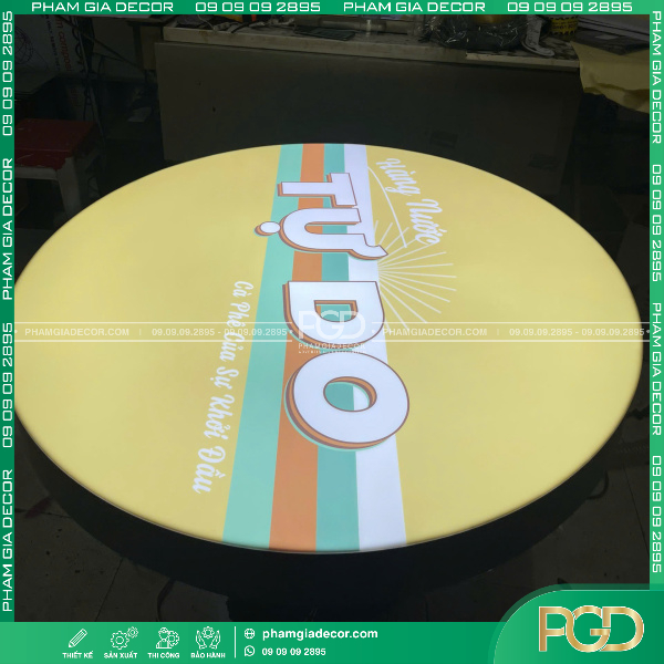 Nguyên lý: Kỹ thuật hút nổi (hay còn gọi là ép nổi) sử dụng nhiệt độ cao để làm mềm tấm mica, sau đó dùng máy hút chân không để tạo hình theo khuôn mẫu đã được thiết kế sẵn. Đối với Quán Cafe Tự Do, chúng tôi đã tạo hình tròn với đường kính 80cm và độ nổi vừa phải, mang lại hiệu ứng 3D mềm mại, tinh tế.