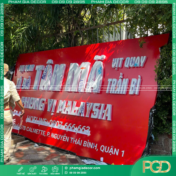 - Nền ALU Đỏ: Sử dụng tấm ALU nền đỏ, một màu sắc tượng trưng cho sự may mắn và thịnh vượng trong văn hóa Á Đông, đồng thời cũng là màu sắc dễ nhìn và nổi bật trong những khu vực đông đúc như Quận 1.