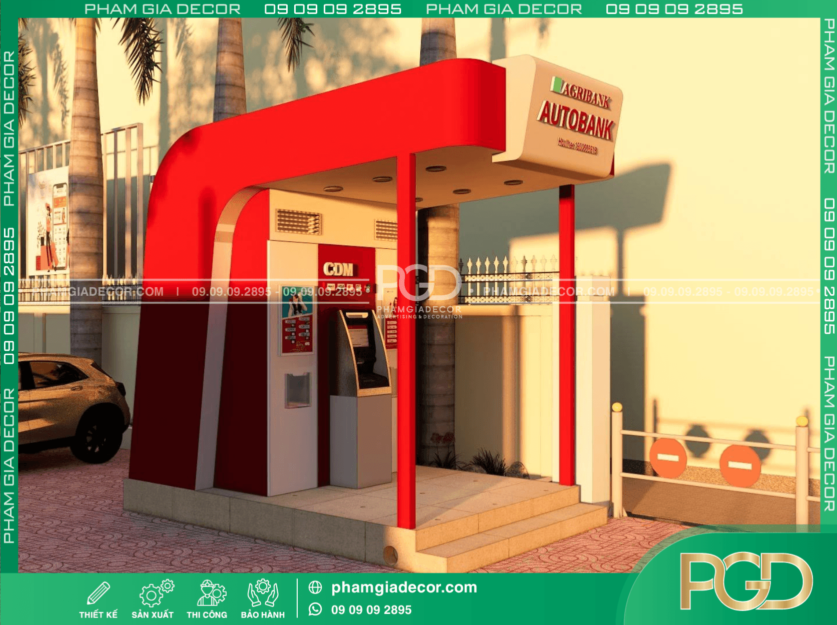 Thi công booth trụ ATM giá rẻ của Phạm Gia Decor tập trung vào độ an toàn, bền vững và nhận diện thương hiệu. Kết cấu khung thép chắc chắn, ốp alu hoặc tôn sơn tĩnh điện chống gỉ, phía ngoài dán decal/tem phản quang nổi bật logo ngân hàng. Hệ thống điện – đèn chiếu sáng, camera, ổ cắm… được đi âm gọn gàng, đáp ứng yêu cầu kỹ thuật và quy định an toàn PCCC, phù hợp lắp đặt ngoài trời tại vỉa hè, bãi xe, khu dân cư, TTTM.