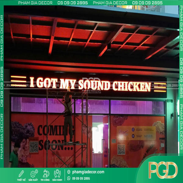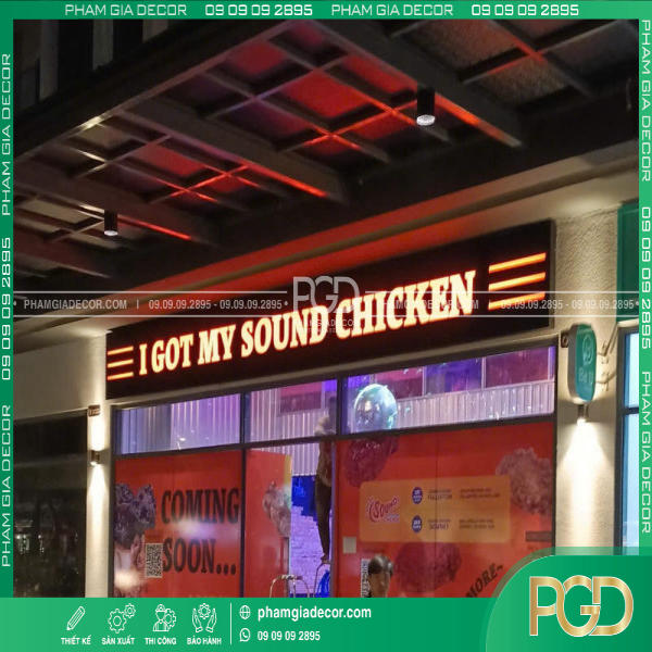 - Gia Công : Alu khoét lọng chi tiết nội dung tên cửa hàng I GOT MY SOUND CHICKEN , ốp trong Mica tông màu chủ đạo Cam sử dụng LED 6K độ chiếu tạo hiệu ứng ánh sáng tỏa LED nổi bật nội dung.